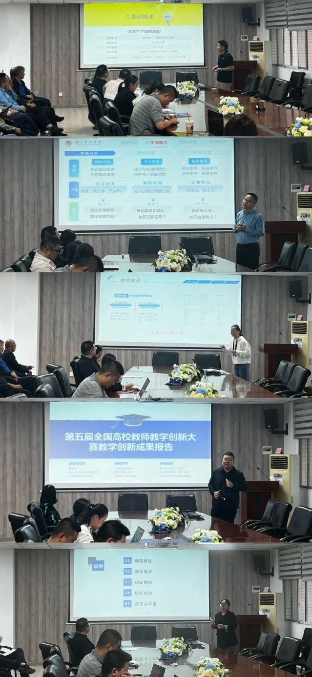 竞赛中5位老师各展所长,亮点纷呈。蔡程老师汇报了新财经课程《机器学习与数据挖掘》,有力提升了会计专业学生的“新财经”素养,使他们更好地适应数智化时代的发展需求。尉晓亮老师汇报的《财务报表分析》课程为学院新获批的国家级一流课程,黄益雄、何雨晴和郝晓敏3位老师分别展示的《审计学》《财务管理》《基础会计学》也均为省级一流课程,各位老师围绕教学目标、学情痛点、创新举措及成效等方面进行全方位展示,有效融合信息技术与课堂教学,体现了以学生为中心的教学理念。充分展现了老师们在课堂教学方面的深厚积淀与持续创新能力。